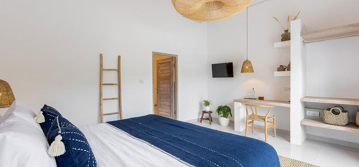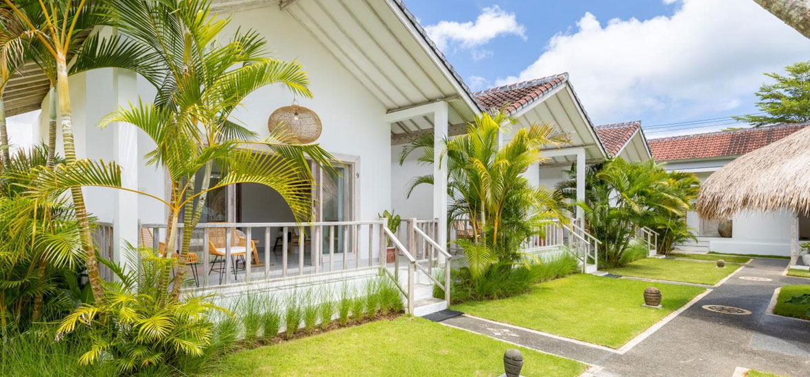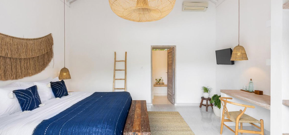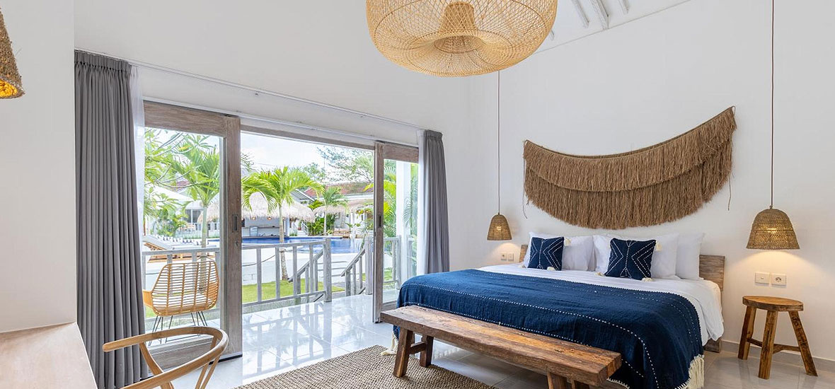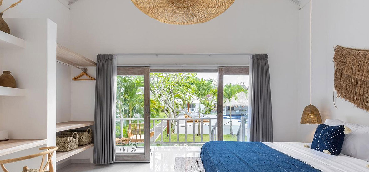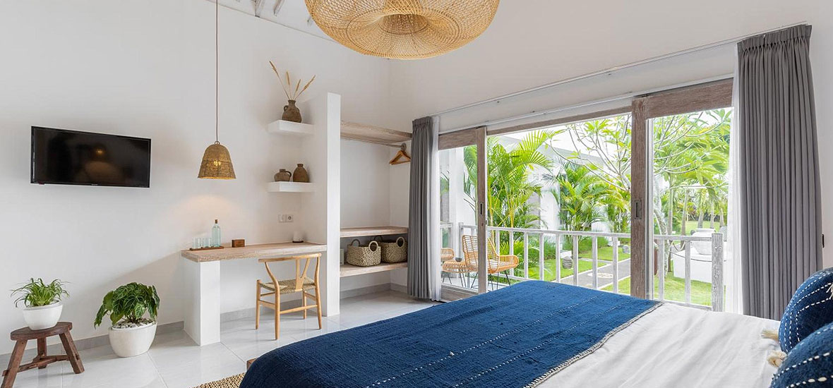 These larges deluxe double room provides you a spacious bedroom featuring a balcony overlooking the pool and the garden. This air-conditioned double room is consisted of of a flat-screen TV with streaming services, a private bathroom with a aalk-in shower, and free Wi-Fi in all rooms!